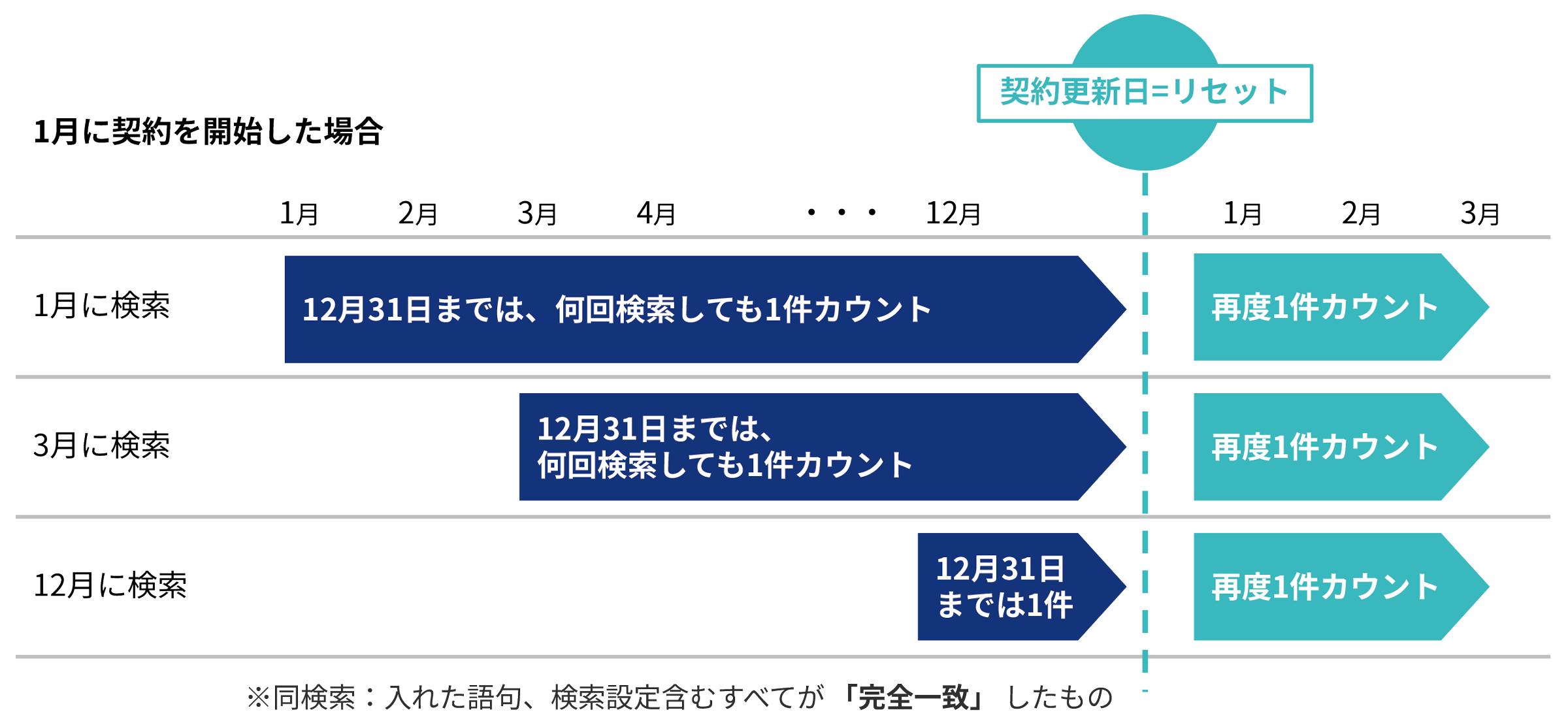 同検索条件の場合、利⽤開始⽉から契約更新⽇までであれば、「何回検索しても1件」としてカウントします。