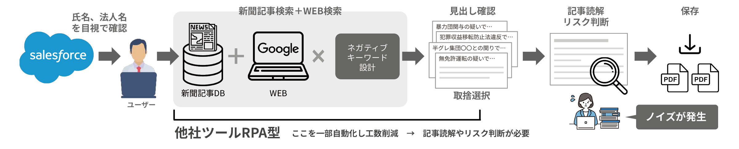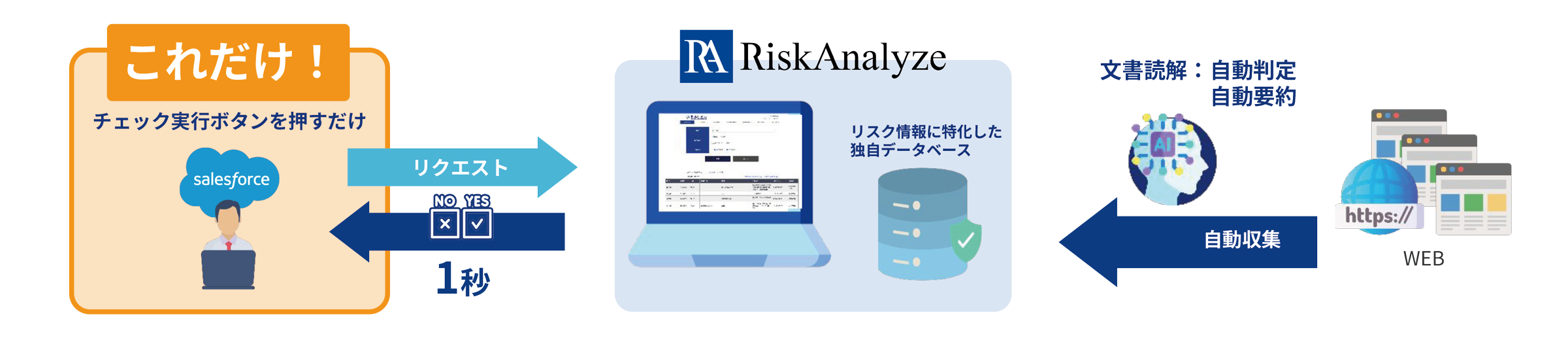 Salesforceに登録している法人や個人の反社会的勢力との関係や過去犯罪歴、その他リスク情報の有無を即時チェックすることでリードタイム短縮に繋がります!